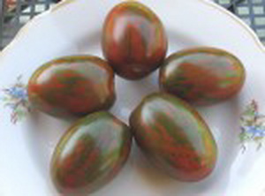 Плоды необычайно красивы: черные с красными и зелеными полосками и штрихами, овальные, ровные, не трескаются, одномерные. Масса плодов около 80 г. Сорт среднего срока созревания, устойчив к болезням. Кусты чуть более 1 м.