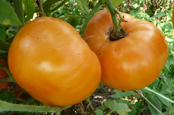 Плоды плоские, ярко-оранжевые, очень мясистые, сладкие. Масса плодов до 1 кг (некоторые заверяют - до 1,5 кг). Высокорослый сорт среднего срока созревания. Кусты высотой до 1,8 м.