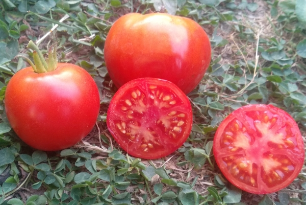 Плоды красные, округлые (плодоножка не вдавлена), с легкими гранями у плодоножки, плотные, не склонны к растрескиванию, вкусные. Масса плодов 150 – 250 г. Кусты высотой до 50 см. Устойчивость отличная. Урожай - до 5 кг. Настоящий шедевр.