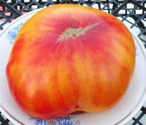 (США) Плоды плоско-округлой формы с оригинальной расцветкой – идущие сверху розовые лучи на желтом фоне, вкусные и красивые. Масса плодов 360 - 960 г. Сорт средне-поздний. Высота куста до 1,8 м.