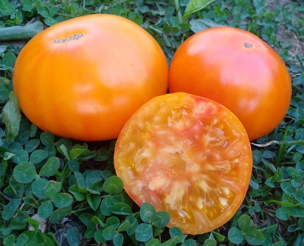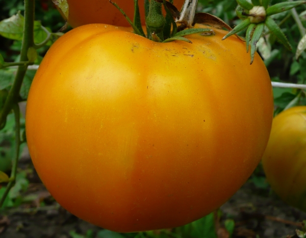 Плоды имеют яркий золотой цвет и сладкий вкус почти без кислоты. Масса одного плода до 600 г, а иногда и до 1 кг. Сорт среднего срока созревания. Кусты высотой до 1,80 м с несколькими кистями увесистых сочных плодов.