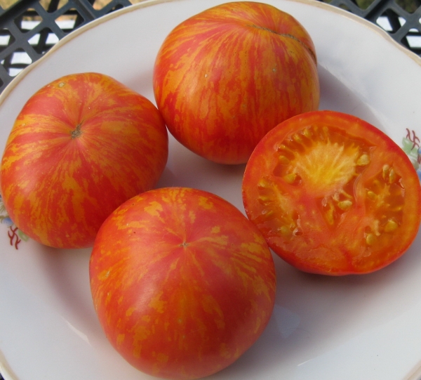 (США) Мякоть плодов словно прозрачная, розово-оранжевых тонов. Плоды плоско-округлые, массой около 150 г. Сорт среднего срока созревания. Высота куста до 1 м.