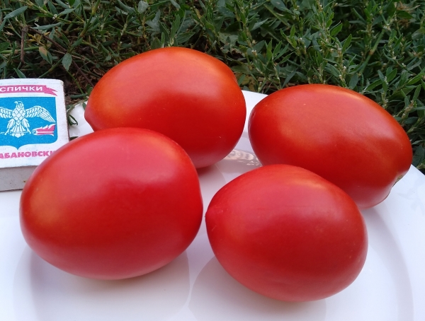 Плоды красные, сливовидные, плотные, мясистые, сладковатые, малосеменные. Уникальный сорт для консервирования, так как плоды имеют высокую плотность. Подходят они также и для длительного хранения. Масса плодов 80 - 120 г. Кусты высотой 0,8 - 1,4 м. Среднеранний сорт, неприхотлив, хорош для теплиц.
