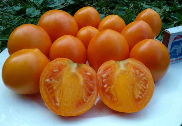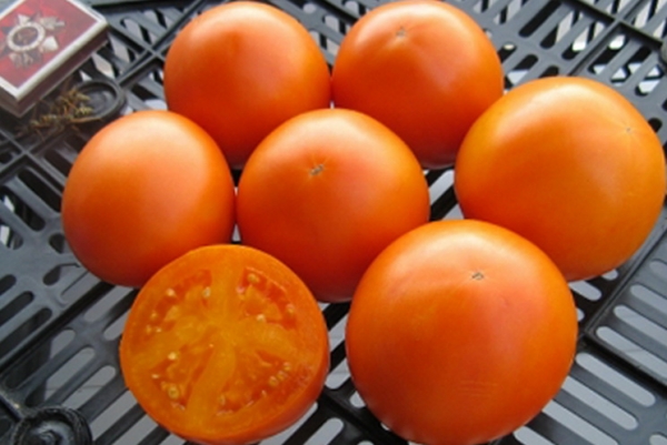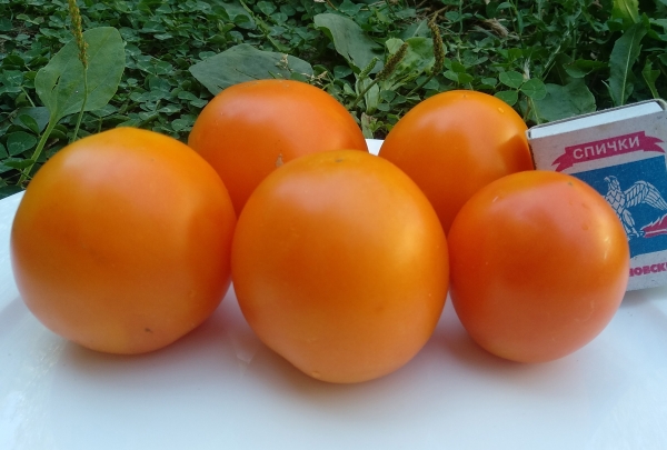Плоды плоско-округлые, оранжевые, сладкие, малосеменные. Масса плодов около около 150 г. Плоды устойчивы к растрескиванию. Очень урожайный сорт среднего срока созревания. Кусты высотой до 1 м.