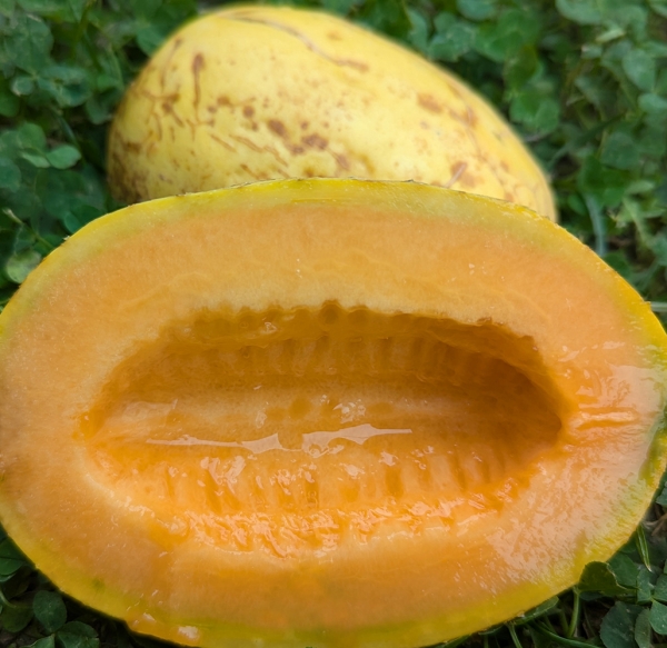Плоды овальные, с жёлто-кремовой, слегка сетчатой поверхностью. Мякоть оранжевая, ароматная, сладкая. Масса 0,5-0,7 кг. Ультраранний, высокоурожайный сорт, имеет повышенную устойчивость к холодной погоде. Растения среднерослые.