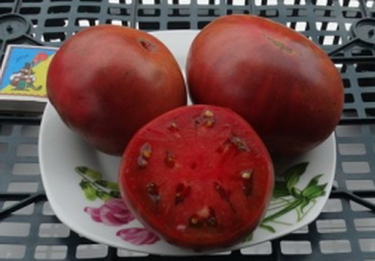 Плоды шоколадного цвета с заметными тёмно-зелёными линиями, мясистые, очень вкусные. Масса плодов около 200 г и более. Кусты высотой до 1 м. Сорт среднего срока созревания.