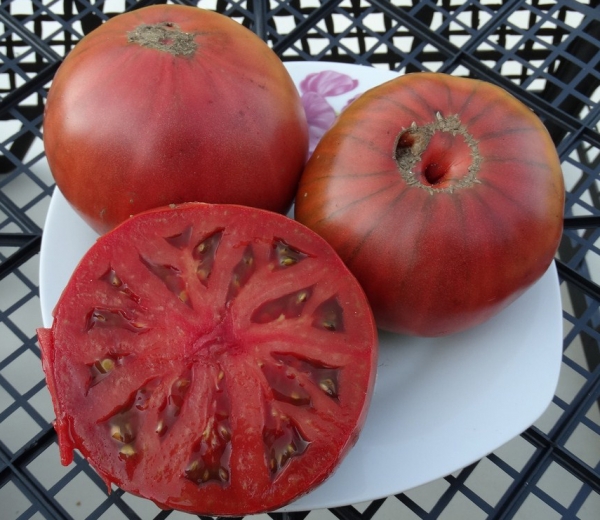 Плоды округлые, черно-фиолетовые с редкими зелеными полосками, с выраженными ребрышками и сочной мякотью. Масса плодов 150-450 г. Они имеют сбалансированный кисло-сладкий вкус. Очень урожайный, среднеспелый, среднерослый сорт. Первые плоды созревают уже в середине июля. Мощные, но компактные растения с картофельными листьями. Высота кустов до 1,2 м.