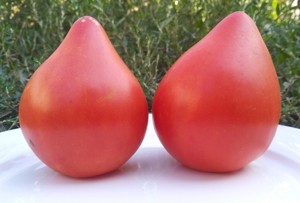 Красные сердцевидные плоды отличного товарного качества и прекрасного вкуса. Масса плодов до 400 г. Из истории сорта известно о массе плодов до 1 кг. Сорт среднего срока созревания. Кусты высотой до 1,2 м.