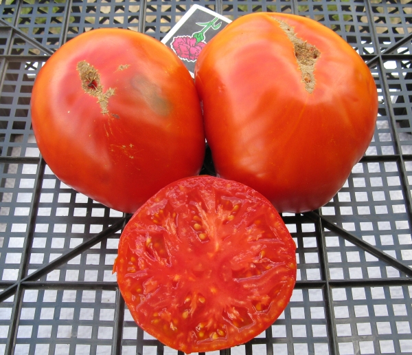 Плоды плоско-округлые, красные, не жесткие, мясистые. Масса плодов до 700 г. Урожайный сорт среднего срока созревания. Кусты высотой до 1,2 м.
