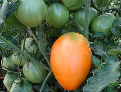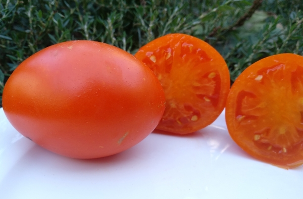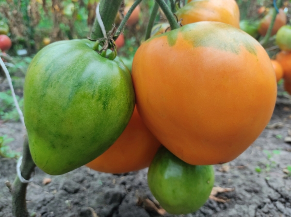Плоды ярко-оранжевые, сердцевидной или сливовидной формы, упругие, очень мясистые, без пустот и почти без семян, отличного вкуса, почти без кислоты. Масса плодов 300 - 500 г. Кусты высотой до 1,5 м. Урожайный сорт среднего срока созревания.