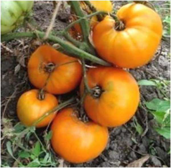 Плоды плоско-округлой формы, насыщенного жёлто-оранжевого цвета. Масса плодов от 300 до 700 г. Мякоть очень плотная, мясистая, вкусная и сладкая. Среднеранний сорт. Крепкие кусты высотой до 1,2 м.