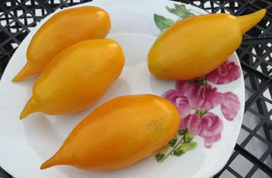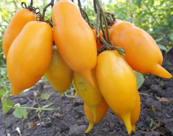 Веерные, красивые кисти, обеспечивают фантастическую урожайность. Плоды - жёлтые сливки, с необычно длинным носиком, вкусные, почти без кислоты. В плодах мало сока. Масса плодов 70 – 100 г. Неприхотливый, высокоурожайный, среднеспелый сорт для открытого грунта и теплиц. Высота кустов в теплице до 2 м.