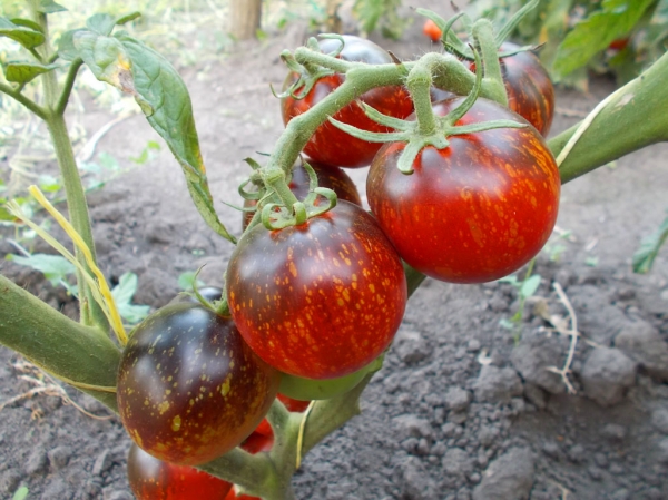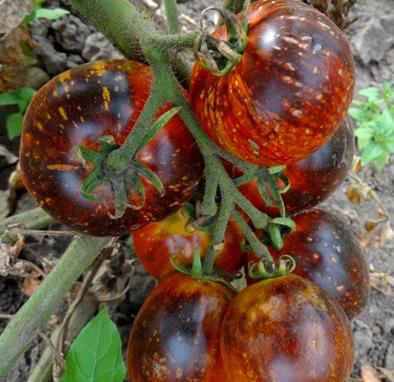 (США) Плоды округлые, с фантастически пестрой окраской: по мере созревания на красном фоне появляются сине-фиолетовые пятна, на которых затем вырисовываются золотистые пятна и полосы. Масса плодов 100 - 140 г. Сорт среднего срока созревания. Кусты высотой до 1 м, с густой листвой.