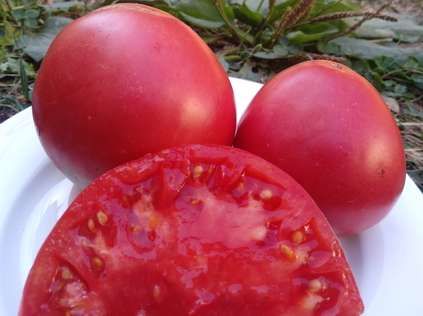 Плоды розово-красные, с лёгкими полосками, плоско-округлые, сахаристые, сладкие. Масса плодов 400 - 500 г. Раннеспелый урожайный сорт. Кусты крепкие, высотой до 1,8 м.