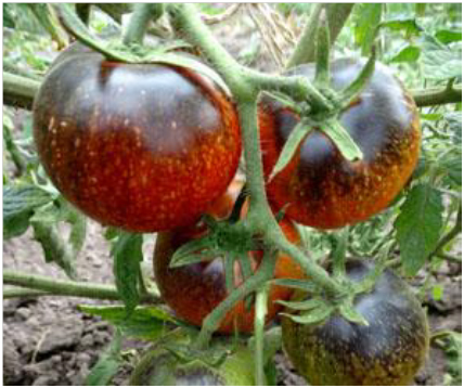 Плоды красно-синие с оранжевыми полосками и крапинками, но антоциановая (синяя) окраска появляется только на поспевающих плодах. Мякоть розово-красная, плотная, сочная, сладкая, очень вкусная. Масса плодов 120-150 г. Кусты высотой до 1 м. Урожайный среднеранний сорт с повышенной устойчивостью к фитофторозу.