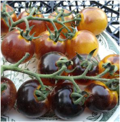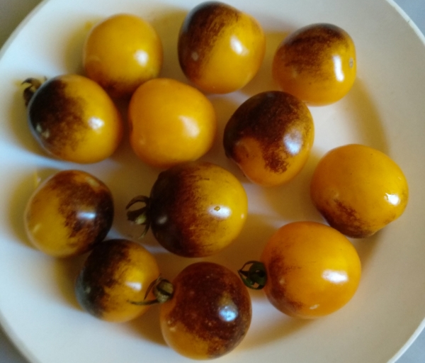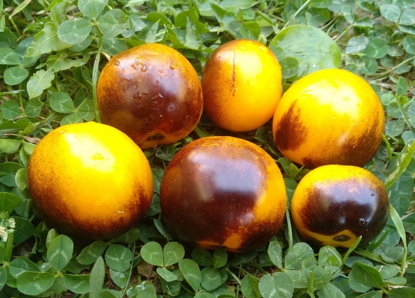 Плоды округлые, при созревании из зелено-фиолетовых становятся желто-коричневыми, сладкие, сочные, с легким привкусом цитрусовых. Масса плодов 30 - 50 г. Урожайный среднеспелый болезнеустойчивый сорт. Кусты высотой до 1,8 м.