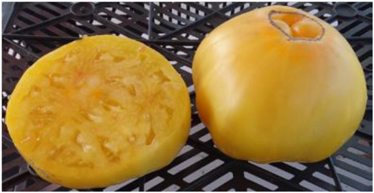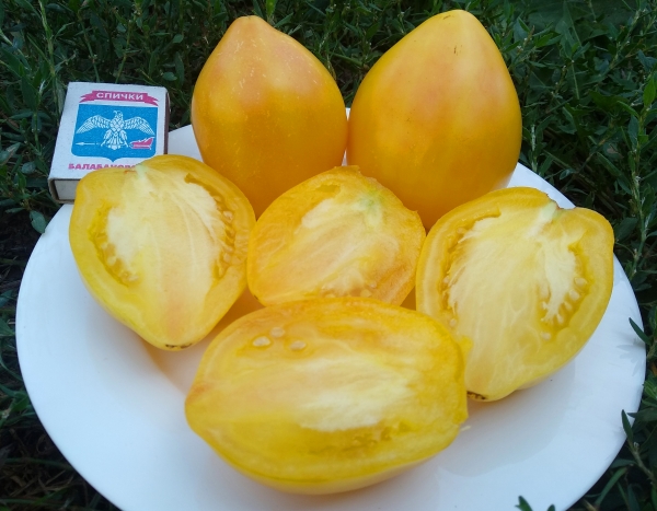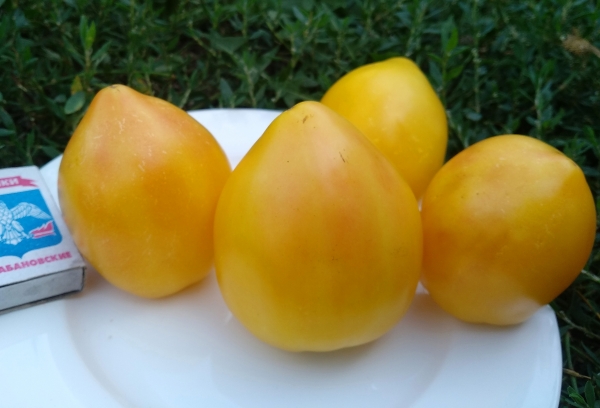 Плоды плоско-округлые, часто с выраженной сердцевидностью, желтые, мясистые, превосходно сладкие на вкус. Некоторые плоды имеют розовый румянец или бледно-розовую "шапочку". Масса плодов - 300 - 400 г и более. Высокоурожайный сорт среднего срока созревания. Кусты высотой до 1,5 м.