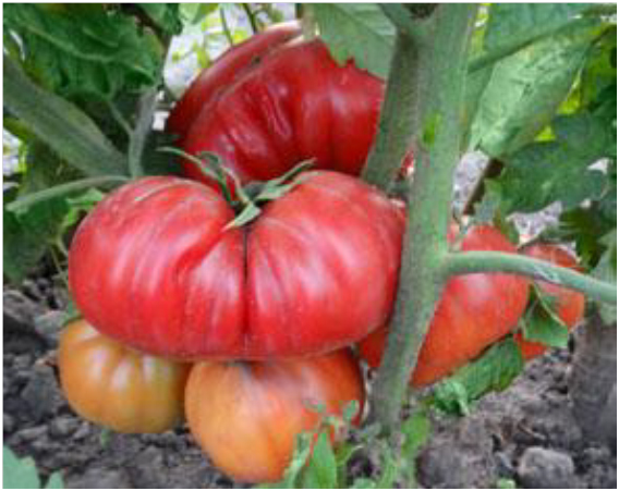 Плоды розовые, плоско-округлые, ребристые, с толстой оболочкой, растут большими кистями. Мякоть сладкая и плотная, почти без семян. Первые плоды очень крупные, отдельные массой до 800 г. В конце вегетации средняя масса плодов 200 - 300 г. Кусты высотой до 1,2 м. Среднеспелый высокопродуктивный сорт.
