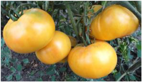 Плоды округло-плоские, желтые с бледно-розовой шапочкой, многокамерные, мясистые, сочные, с отличным вкусом. Масса плодов 250 - 450 г. Среднеспелый высокоурожайный сорт. Кусты высотой до 1,8 м.