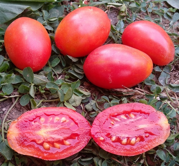 Плоды розовые, глянцевые, удлиненные, упругие, без трещин и пятен, не гниют, лежкие, с отличным вкусом и довольно сладкие. Масса плодов 15 - 30 г. В кистях их до 50 штук. Ранний сверхурожайный сорт. Кусты высотой 1,5 - 1,8 м.