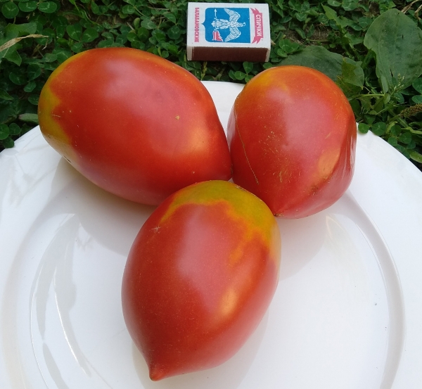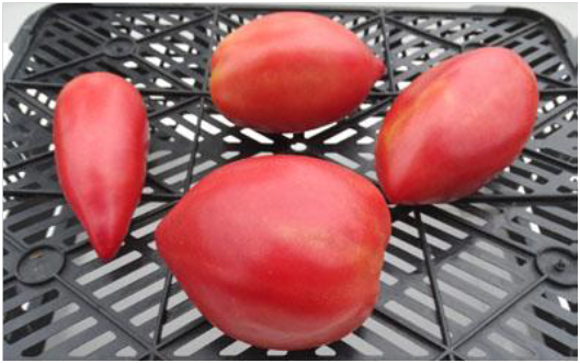 Плоды розовые, удлиненные, с носиком, до 15 см длиной, собраны в большие кисти. Масса плодов 100 - 200 г. Среднепоздний высокоурожайный сорт. Кусты высотой до 1,5 м.