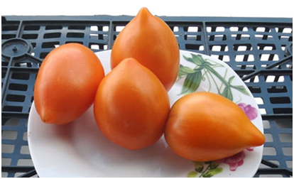 Плоды оранжевые, плотные, мясистые, вкусные, разной формы: от сердцевидной до удлинённой сливки. Масса плодов 90 - 140 г. Очень урожайный сорт среднего срока созревания. Кусты высотой до 1,8 м.