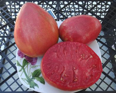 Плоды розовые, сердцевидные, плотные, мясистые, с приятным ароматом и отличным вкусом хороших домашних помидоров. Масса плодов 200 - 600 г, средняя масса - 300 г. В кистях по 3-4 плода. Среднерослый, среднеспелый, урожайный сорт, для открытого грунта и пленочных укрытий. Кусты высотой до 1,2 м.