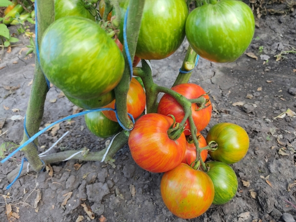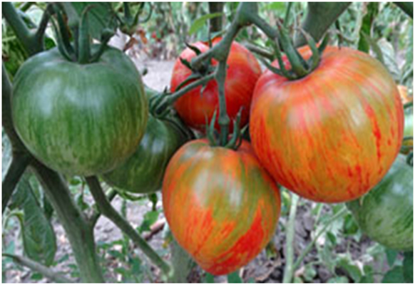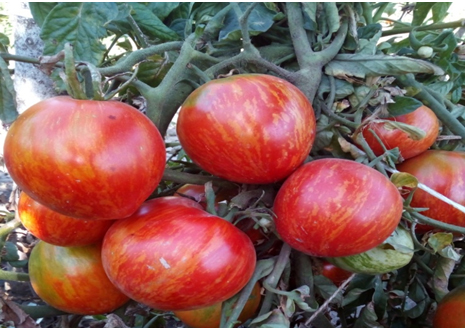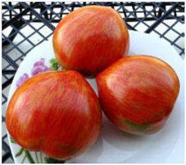Высокоурожайный сорт среднего срока созревания. Плоды сердцевидной формы, ярко окрашены, пестрые (красные с золотыми полосами), гладкие, упругие, без трещин и пятен. Масса плодов 140 - 200 г. Плоды этого сорта идеально подойдут для рынка. Сладость зависит от погодных условий. На вкус могут быть немного кисловаты. Без пасынкования кусты могут быть перегружены урожаем, что также может уменьшить сладость. Кусты высотой до 1 м.