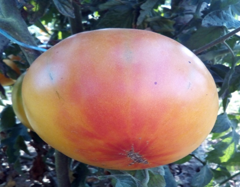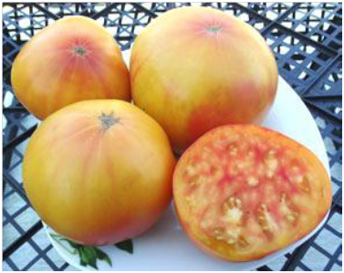 Плоды желто-розовые, округло-плоские, плотные, мясистые, сладкие на вкус. Масса плодов 200 - 400 г. Сорт среднего срока созревания. Кусты высотой до 1,7 м.