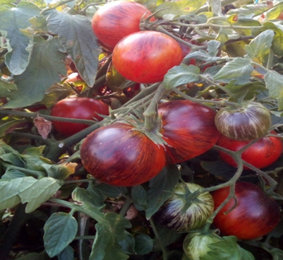 Плоды красно-синие, округлые, сочные, вкусные, сладкие. Масса плодов 30 - 100 г. В кистях по 6-9 плодов. Высокорослый, среднеспелый, урожайный сорт, с повышенной устойчивостью к фитофторозу и с длительным периодом плодоношения. Кусты высотой около 1,6 м и более.