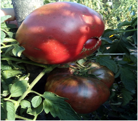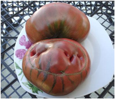 Плоды округло-плоские, шоколадного цвета с темно-розовой мякотью, сладкие и очень вкусные. Масса плодов 200 - 300 г. Сорт среднего срока созревания. Куст высотой 1,2 – 1,5 м.