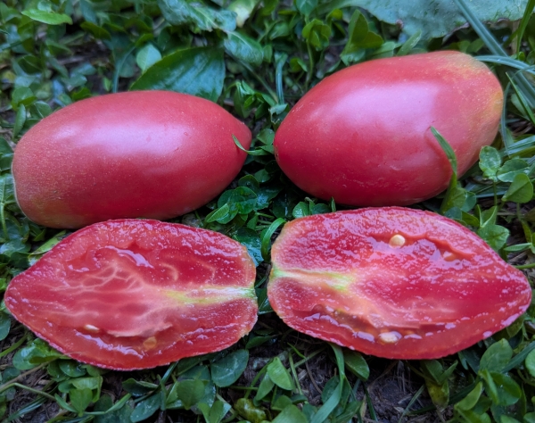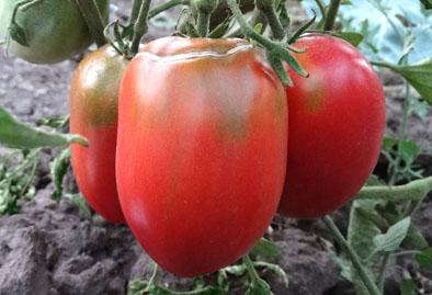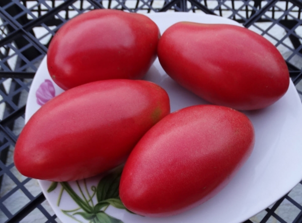 Плоды розовые, удлиненные, мясистые, с отличным вкусом, сладкие. Масса плодов 100 - 150 г. Кусты высотой до 1 м. Сорт среднеспелый, можно выращивать без пасынкования с минимальным уходом. Листья небольшие, кусты хорошо насквозь освещаются.