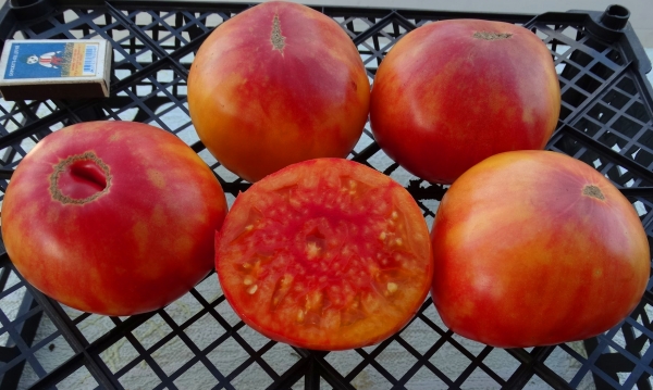 Плоды округло-плоские, красно-оранжевые. Мякоть также двуцветная, сочная, ароматная, сладкая на вкус. Масса плодов 200 - 500 г. Среднеспелый, урожайный сорт. Мощные кусты высотой до 1,8 м.