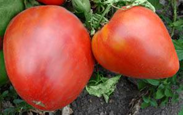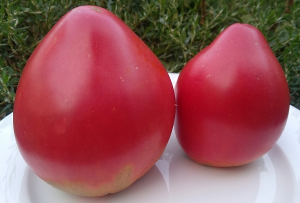 Плоды розовые, удлиненные сердцевидные, вкусные, сладкие, не трескаются. Масса плодов 150 - 450 г. Высокоурожайный, среднерослый, средне-ранний сорт. Кусты высотой до 1 м.
