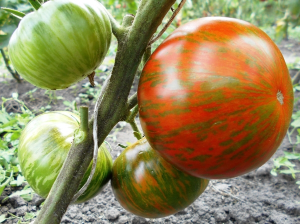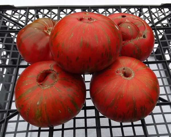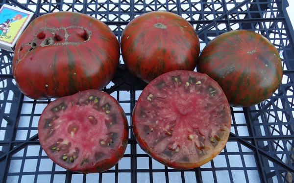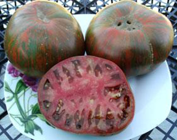 (США) Плоды плоскоокруглые, пестрые: красно-зеленые полосы по всей поверхности, мясистые, многокамерные, с насыщенным томатным вкусом, сладкие. Масса плодов 250 - 450 г. Высокоурожайный сорт среднего срока созревания. Кусты высотой до 1,5 м.