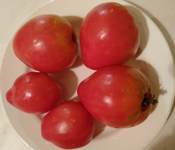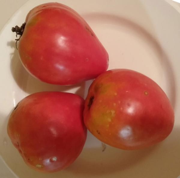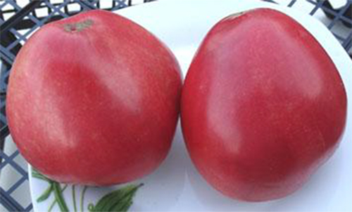Плоды розовые, идеально сердцевидной формы, вкусные, мясистые, семян немного. Масса плодов 400 - 600 г. Средне-ранний высокоурожайный сорт с плодами отличного качества. Кусты высотой до 1 м.