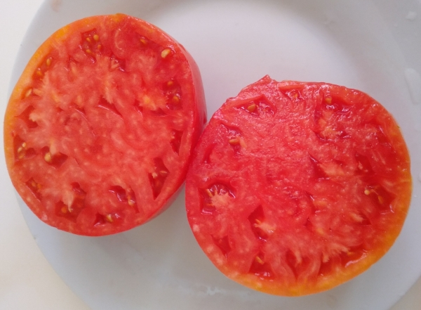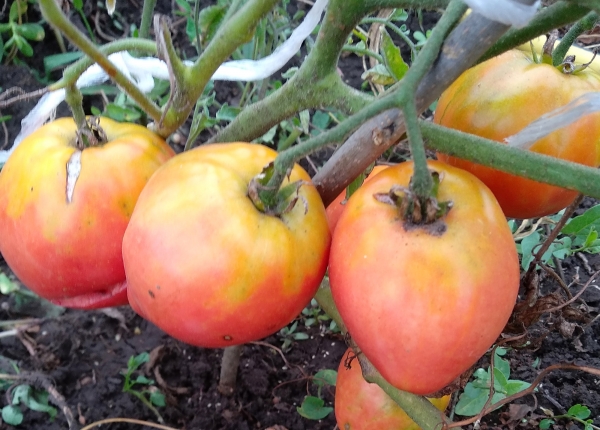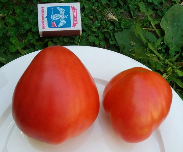 Плоды розово-красные, очень мясистые, сочные, вкусные. Масса плодов 350 - 460 г. Отдельные плоды массой до 800 г. Ранний, высокоурожайный сорт. Первые плоды собирают за 3 недели до среднеспелых. Напоминает известный сорт «Батяня», но плоды крупнее, с хорошо выраженной сердцевидностью. В открытом грунте кусты вырастают высотой около 70 см. В теплице кусты могут вырасти значительно выше, так как сорт индетерминантный.