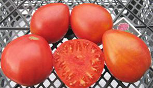 Плоды красные, сердцевидные, сладкие и вкусные. Масса плодов 150 - 250 г и до 450 г. Среднеспелый сорт с высокой урожайностью. Этот сорт отлично себя чувствует и хорошо плодоносит в теплицах. В ОГ без полива высота может быть всего 1 метр. На поливных землях и в теплицах его высота будет 1,8 м и выше.