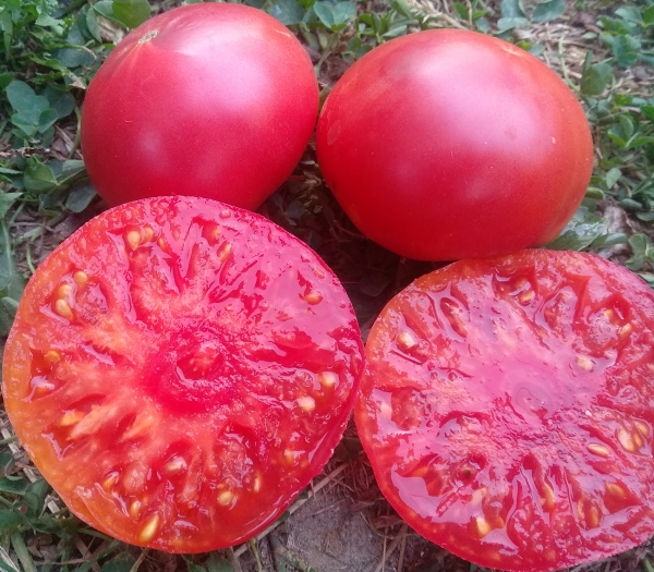 Плоды розовые, округло-плоские, ровные, мясистые, сочные, вкусные. Масса плодов 200 - 400 г. Раннеспелый сорт. Кусты высотой около 60 см.