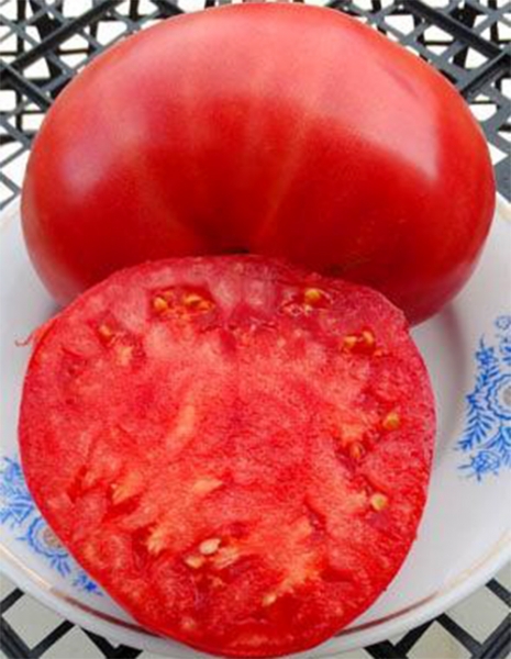 Плоды красные, округло-плоские, слегка ребристые у плодоножки, малосеменные, очень вкусные, с отличным балансом сладости и кислоты, мясистые и плотные, пригодны для дальней перевозки. Масса плодов 200 - 400 г и более, отдельные плоды - до 700 г. Средне-поздний высокоурожайный сорт. Кусты мощные, высотой до 1,8 м.