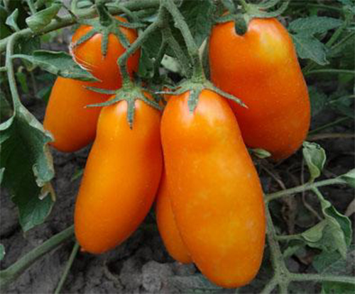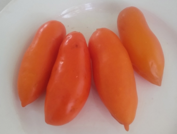 Плоды желто-оранжевые, удлиненно-перцевидной формы, очень вкусные, плотные. Масса плодов 150 - 200 г. Плоды могут храниться до 3-х месяцев. Сверхурожайный, среднеранний сорт. Кусты высотой около 2 м, словно гирляндами, увешаны большими кистями плодов. В открытом грунте и без полива кусты более низкие.