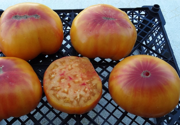 Плоды оранжево-розовые, плоскоокруглые, мясистые, сочные. Мякоть мраморная, сладкая на вкус. Масса плодов 400 - 960 г. Срывать лучше не переспевшие плоды. Среднеспелый, урожайный сорт. Кусты высотой до 1,8 м.
