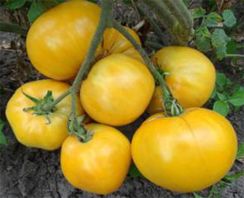 Плоды плоскоокруглые или круглые, слегка ребристые, имеют необычный цвет - скорее желтый, чем кремовый, со слабо выраженным румянцем. Но главное - вкус: мы не пробовали более сладкие томаты (не считая черри). Масса плодов 300 - 700 г. Высокоурожайный болезнестойкий сорт среднего срока созревания. Кусты высотой до 1,5 м.