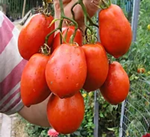 Плоды красные, сливовидные, удлиненные, с носиком, длиной до 10 см, с прекрасным вкусом. Масса плодов 150 - 400 г. Урожайный среднеспелый сорт. Кусты высотой до 2 м.