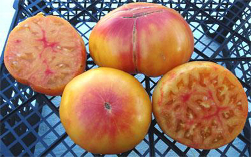 (США) Плоды плоскоокруглые, оранжевые с красными полосами, вкусные, сладкие. Масса плодов 200 - 500 г. Среднеспелый сорт. Кусты высотой до 1,8 м.