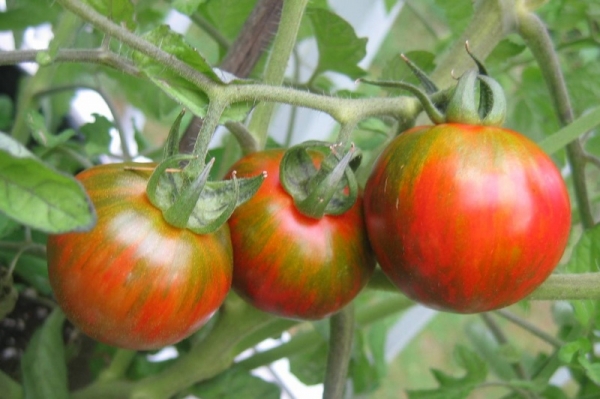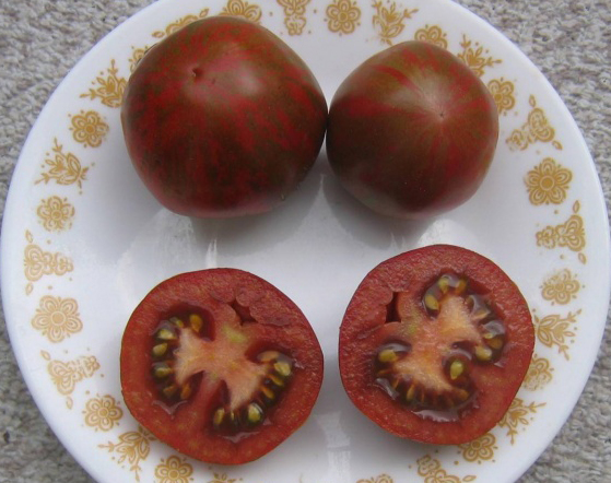 Плоды круглые, коричнево-красные с тёмно-зелёными полосами и штрихами, хороши на вкус. Масса плодов 50 - 100 г. Урожайный среднеспелый сорт. Кусты в теплице высотой до 1,5 м, в открытом грунте могут быть пониже.