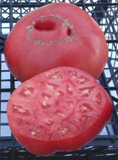 (США) Плоды розовые, плоско-округлые, мясистые, на вкус особо сладкие. Масса плодов 300 - 700 г. Высокоурожайный среднеспелый сорт. Кусты вырастают в до 2 м даже в открытом грунте, стебли их очень мощные. На западе этот сорт считают одним из самых урожайных и вкусных.