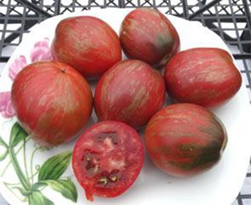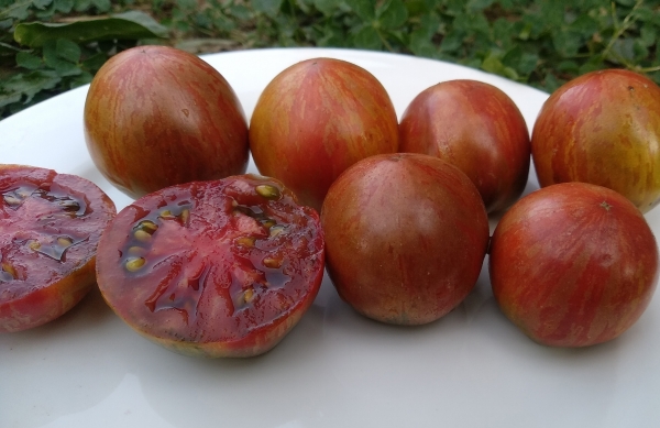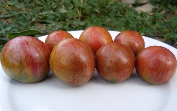 Плоды круглые, пестрые: красные с золотыми и черными полосками; мясистые, плотные, не очень сочные, с насыщенным ароматом, сладкие на вкус. Хорошо хранятся после сбора. Масса плодов 50 - 80 г. Высокоурожайный среднепоздний штамбовый сорт. Растения высотой до 50 см, с гофрированными светло-зелеными листьями. Сорт идеально подходит для небольших садов и балконов.