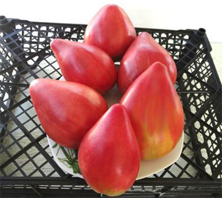 (США) Плоды розовые, удлиненные сердцевидные, одномерные, вкусные, сладкие. Масса плодов 250 - 500 г, в истории сорта упоминается плод массой до 1 кг. Сорт среднего срока созревания. Кусты высотой до 1,5 м.