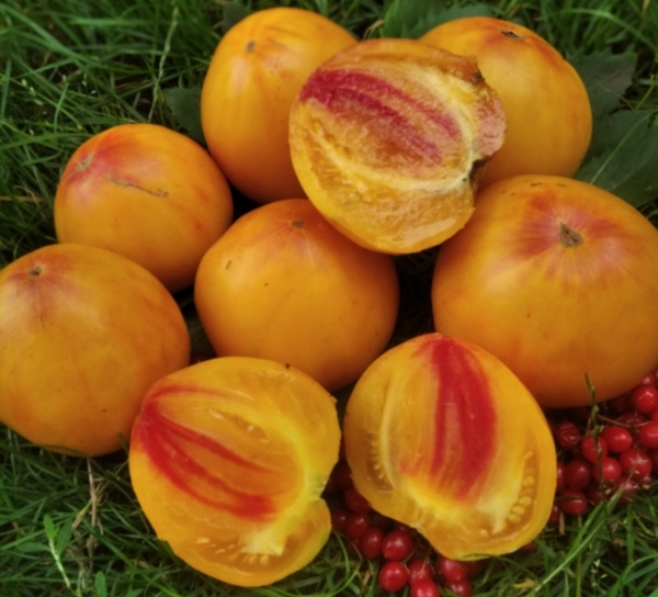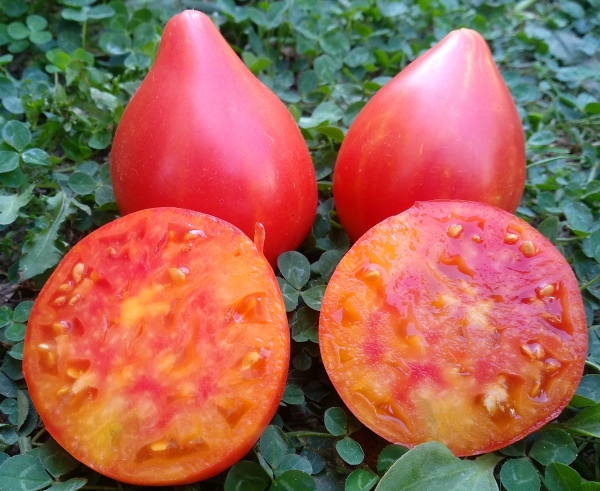 Плоды - двуцветные сердца, сладкие, мясистые, сочные, очень вкусные. Масса плодов 150 - 300 г. Высокоурожайный среднеспелый сорт. Может обильно плодоносить в открытом грунте при жаркой и засушливой погоде. А в теплице плодоносит без остановки. Кусты высотой до 1,8 м и больше.